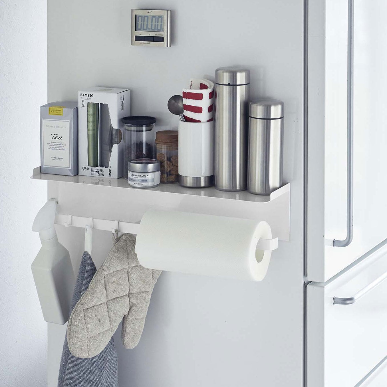 マグネットが付く冷蔵庫横やキッチンパネルに貼り付けて、よく使うキッチンツールや布巾などを収納できます。ワイドなサイズで広々使えるトレー付き。ハンガーには布巾も収納できます。