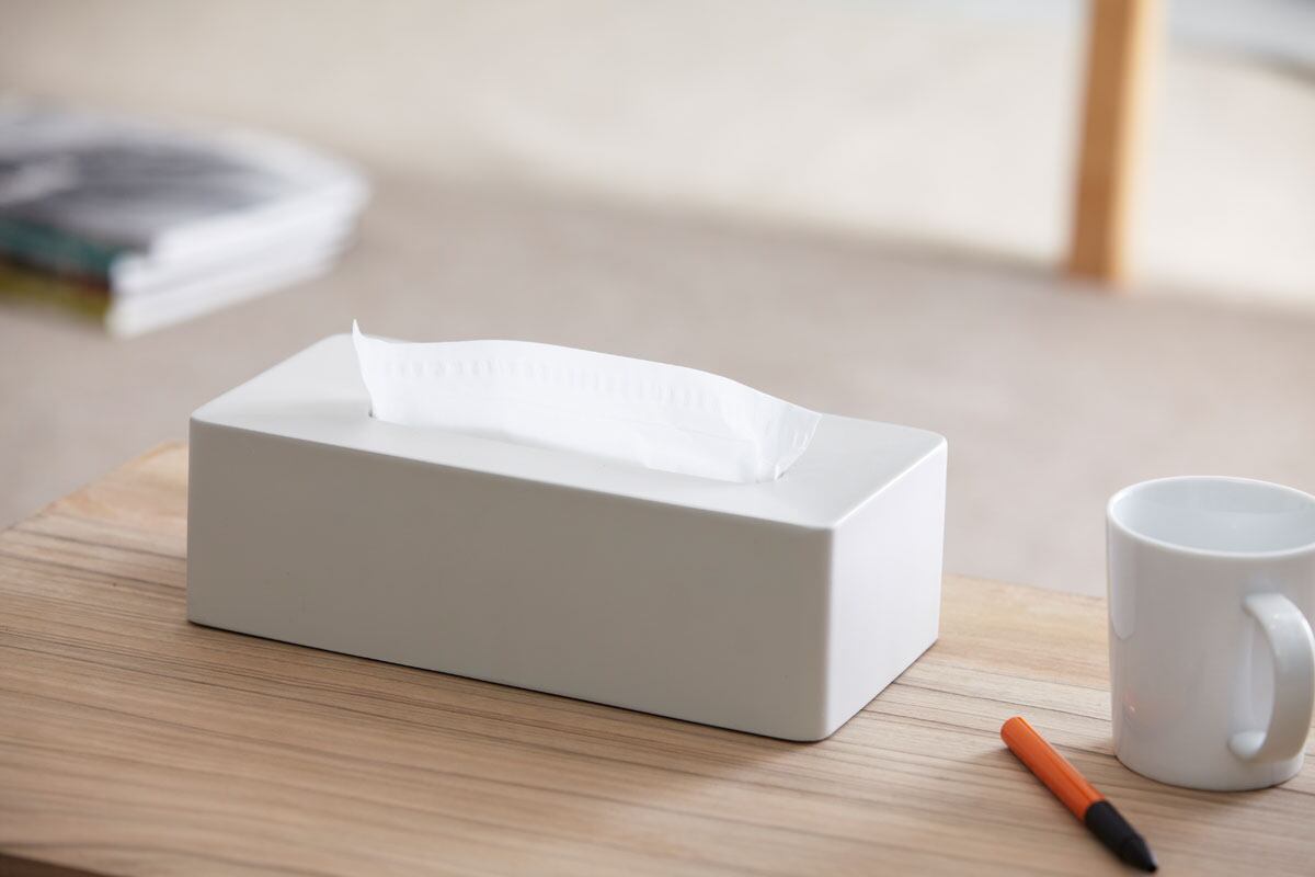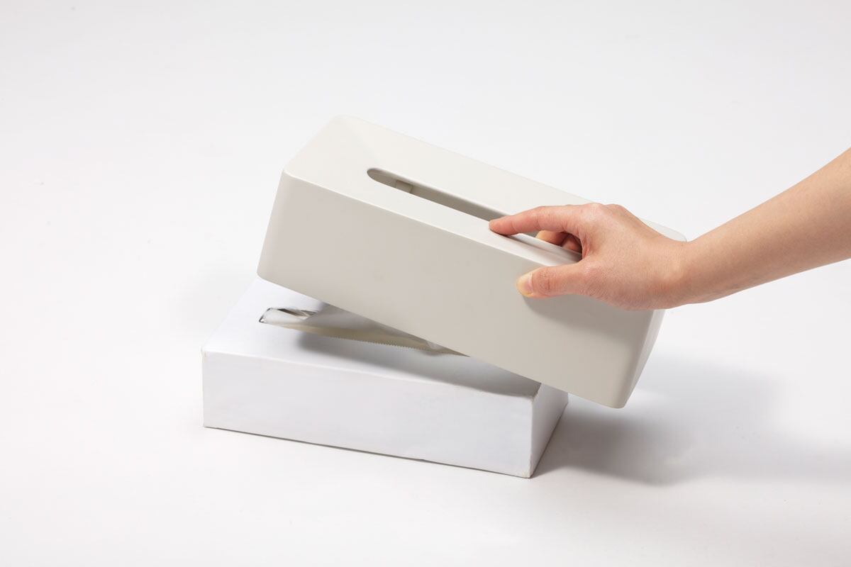 ティッシュ箱の上から被せるだけで、箱が本体に固定されるティッシュケース。ティッシュ箱は一度はめ込むと、ケースを持ち上げても落ちません。また、ケースには適度な重みがあるため、箱が浮き上がらずスムーズにティッシュを引き出せます。陶器のようなしっとりしたマットな質感がラグジュアリーなティッシュケースです。