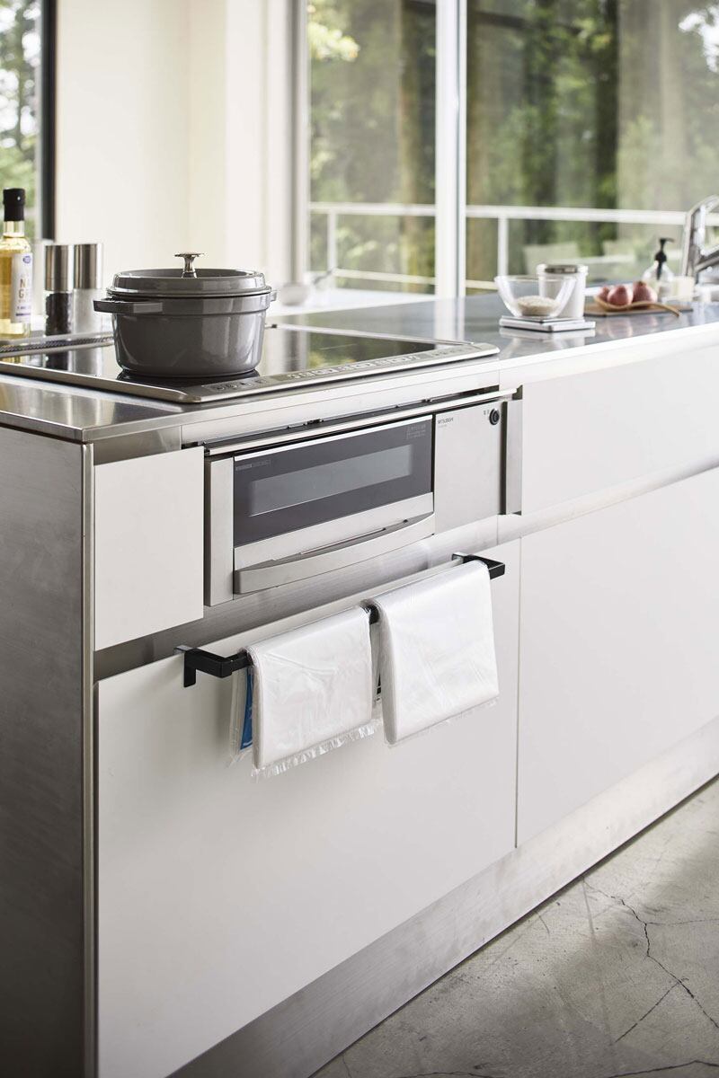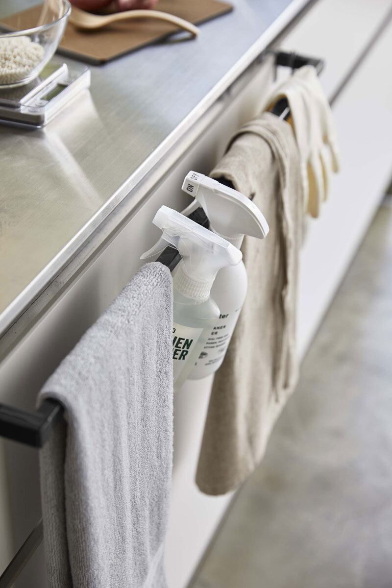 用途の違うタオルや布巾、スプレー類など、散らかりがちなキッチン用品をまとめて収納できます。扉や引き出しの幅に合わせて、伸縮できるかるから、大容量に収納。置き場所に困るゴミ袋を掛けて収納もできます。