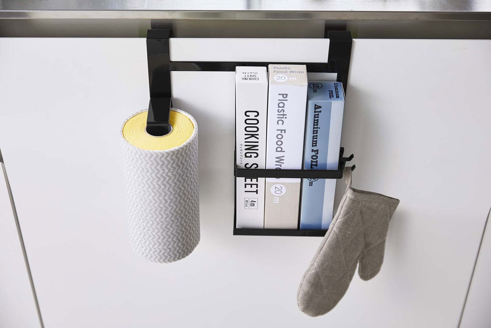 シンク扉に掛けるだけの簡単取り付けで、よく使うキッチンペーパーやラップ、ポリ袋、キッチンクロス、キッチン小物などをまとめて収納します。扉の内側にも設置できます。小物を引っ掛けるのに便利なフック付き。
