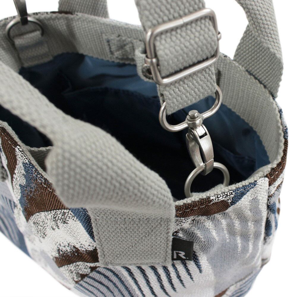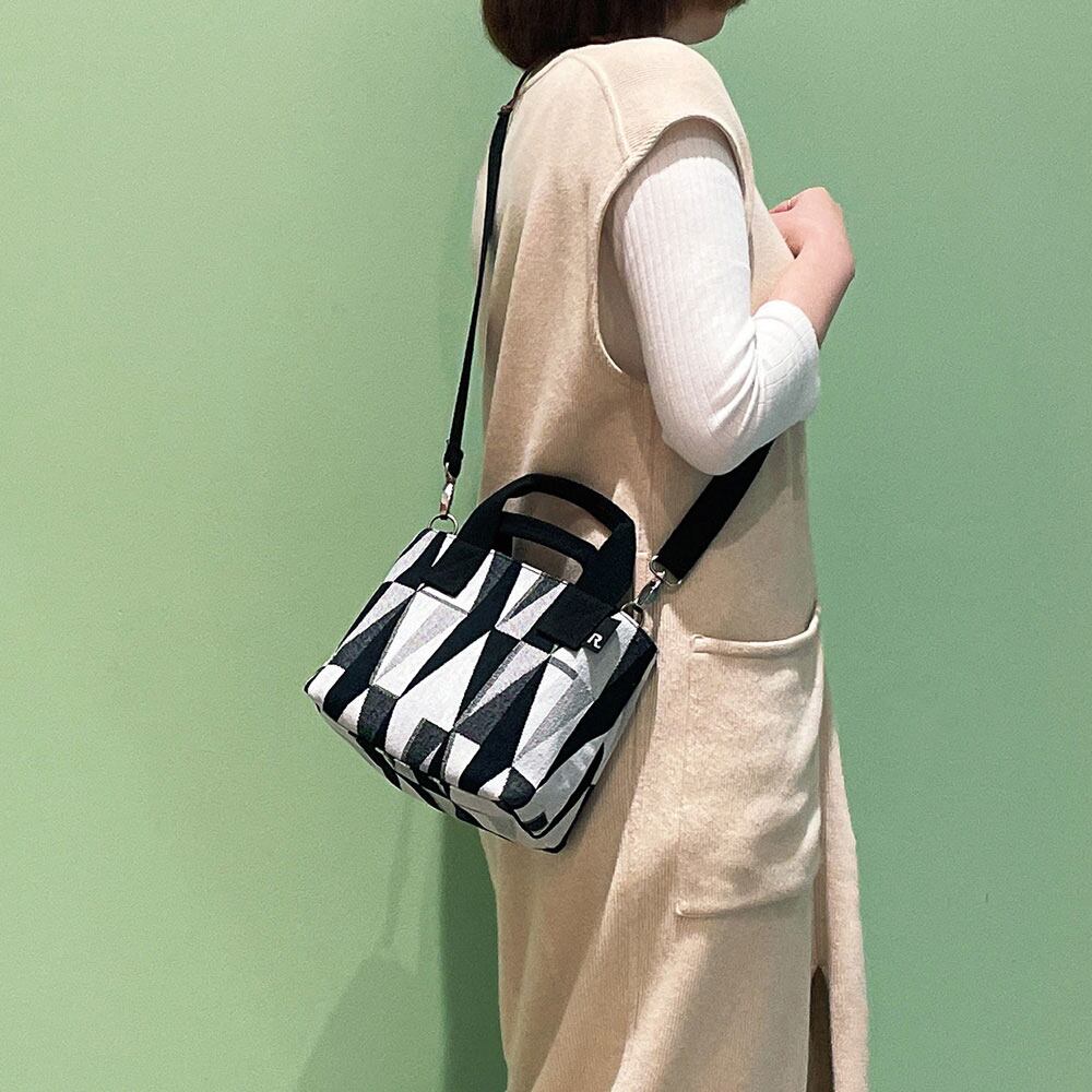 デザイン性のある幾何学柄の織り生地を使用した、使う楽しさを兼ね備えた気分をあげてくれるトートです。取り外し可能なショルダー付きで、トートバッグ・ショルダーバッグの2wayで使えます。ショルダーは長さ調整ができて、持ち手の長さを変えられるので、斜め掛けもできます。