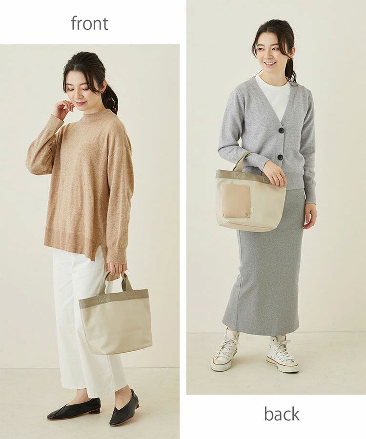 しっかりしたつくりで自立するシルエット。本革のような質感で、上品でしっかりした雰囲気。汚れや水滴なども拭き取りやすく機能的です。底マチが広く、ランチボックス、ボトル、A5ノート、大き目ポーチなど収納力抜群です。モノの出し入れがしやすく、中身もパッと確認できます。
