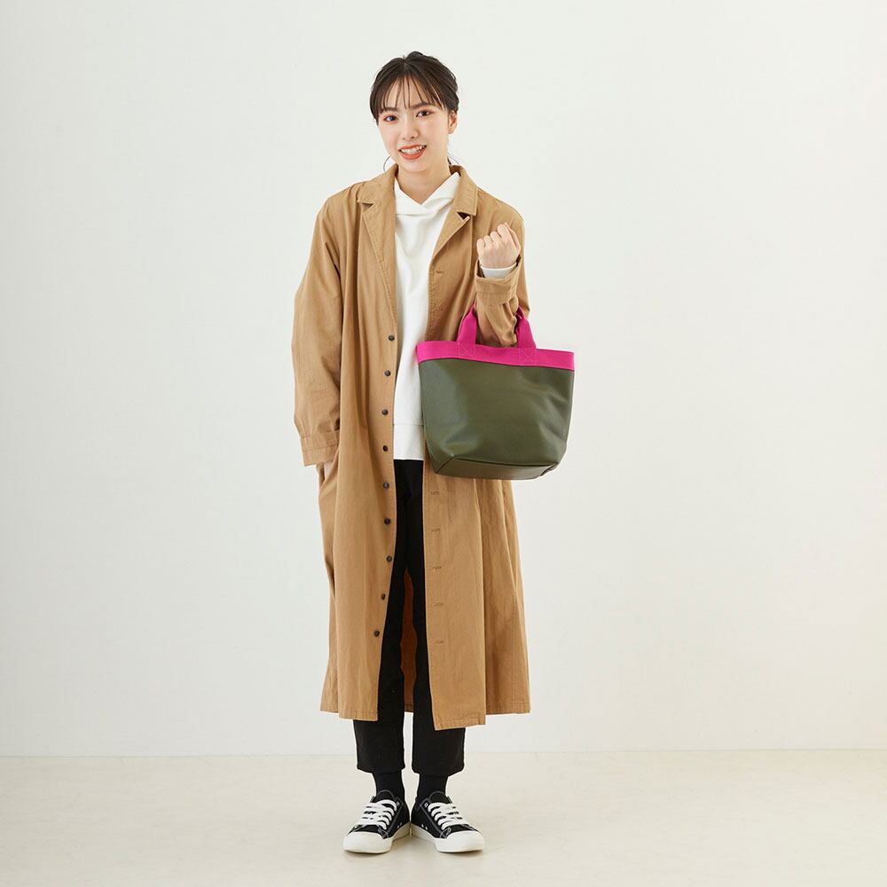 しっかりしたつくりで自立するシルエット。本革のような質感で、上品でしっかりした雰囲気。汚れや水滴なども拭き取りやすく機能的です。底マチが広く、ランチボックス、ボトル、A5ノート、大き目ポーチなど収納力抜群です。モノの出し入れがしやすく、中身もパッと確認できます。