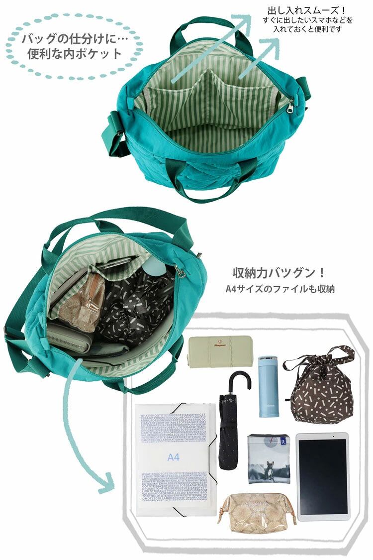 ショルダー付き(取り外し不可)でトートバッグ、ショルダーバッグの2way仕様。肩掛けや斜めがけなど、両手をふさぐことなく使用できます。