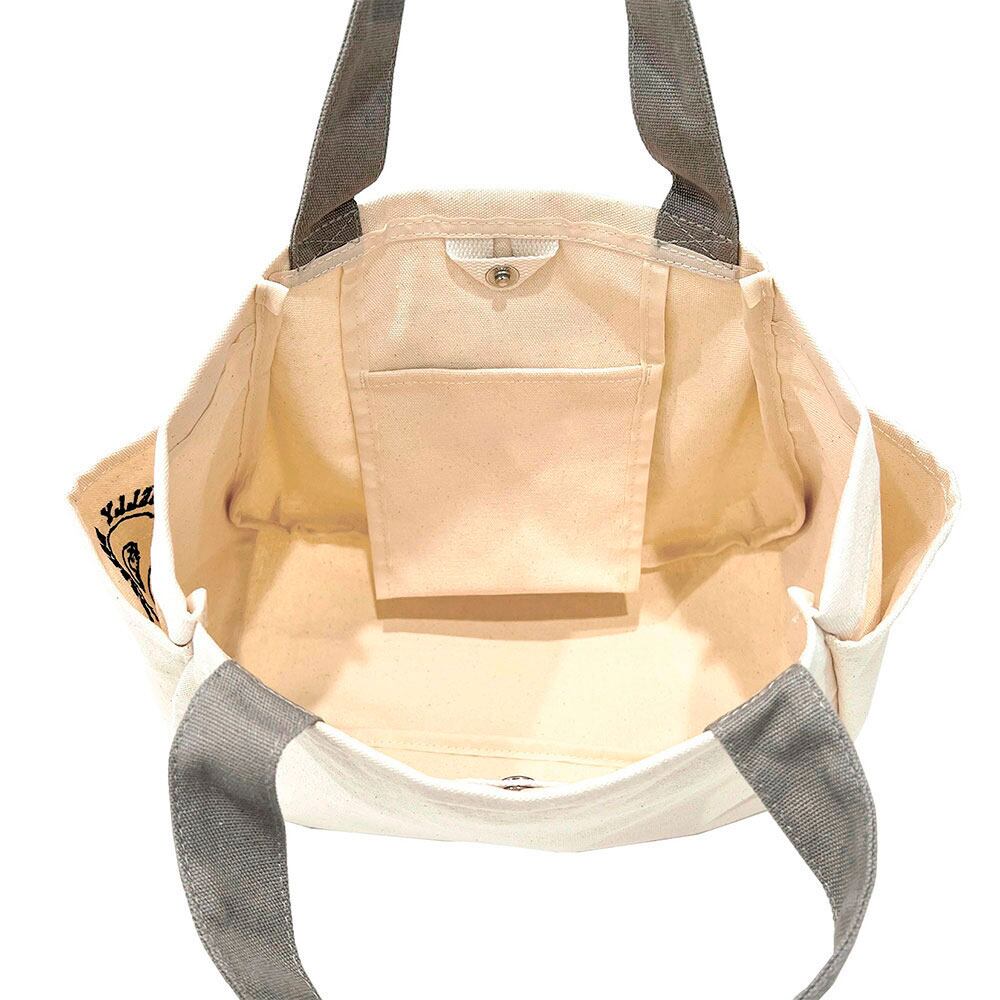 しっかりしたコットンキャンバス生地に、スヌーピーが刺繍されたトートバッグ。コロンとした丸みのあるかわいいフォルム。両サイドのポケット入り口が斜めにカットされ、アクセントになっています。ファスナー付き外ポケットもあり、鍵などの大切なものも安心して入れておけます。