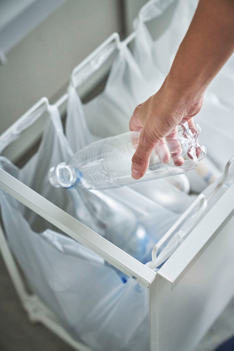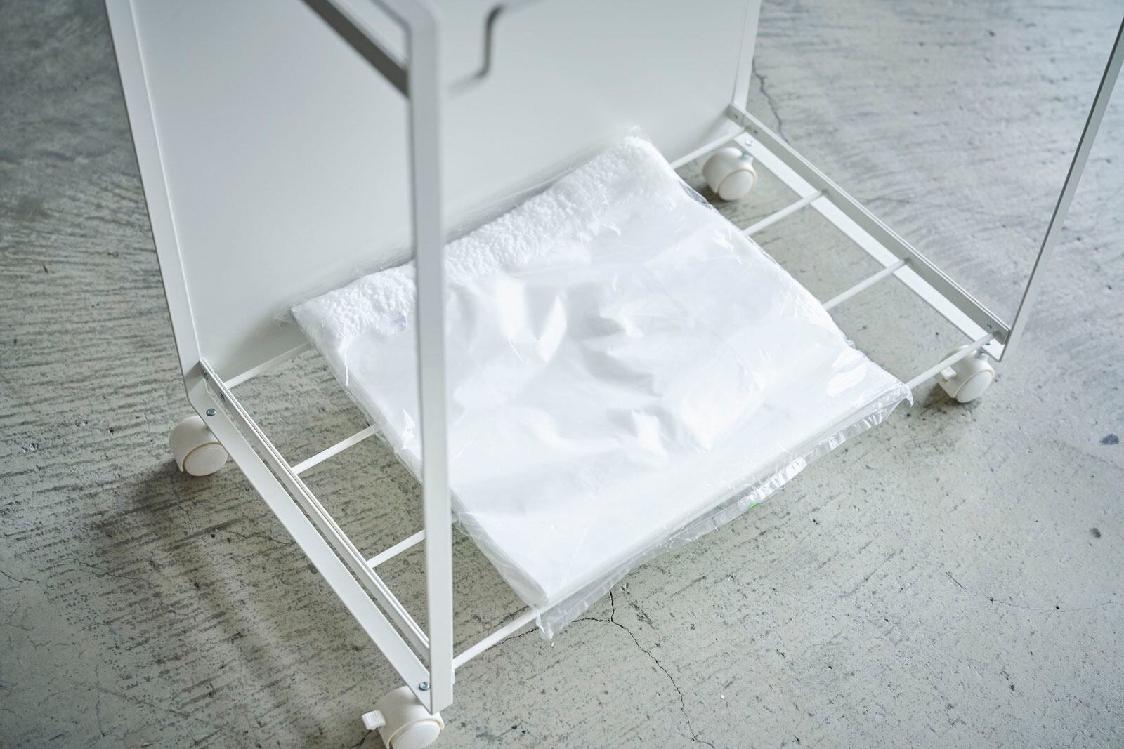 レジ袋を隠して分別できて、見た目もスッキリ。スタイリッシュなデザインの、おしゃれな分別式ゴミ箱です。お持ちのゴミ袋やコンビニやスーパーのレジ袋を引っ掛けるだけの簡単セット。本体にはハンドルとキャスターが付いているので、袋の取り外しやお掃除の際の移動もスムーズです。底面にはレジ袋のストックを収納できます。