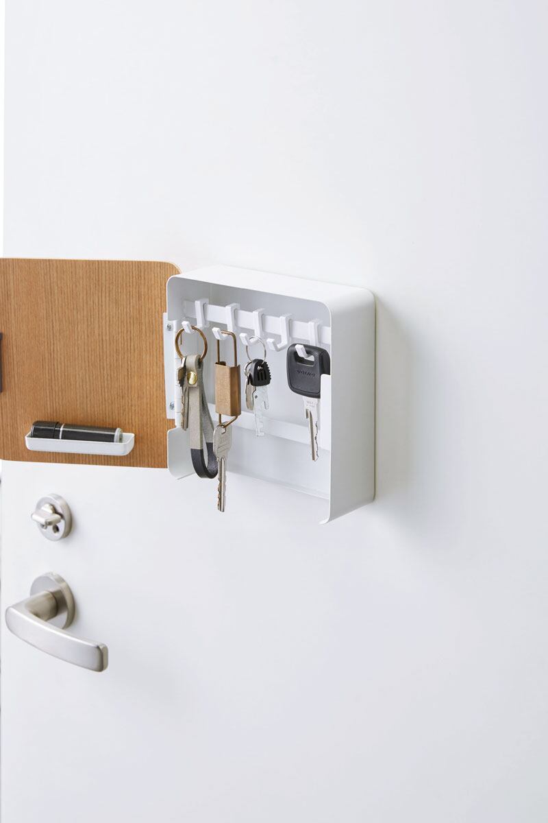 マグネットの付く玄関ドアに簡単取り付け、マグネット式で便利な2段式の鍵収納ボックス。インテリアに合う木目の扉付きで、鍵がスッキリと隠せます。5つのフックは自由に脱着できるので、フック間の距離など自由に調節可能です。