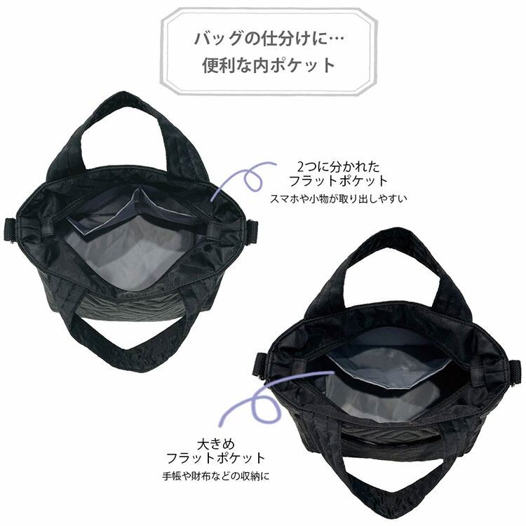 デザイン性のある幾何学柄のキルティングを使ったショルダーにもトートにもなる2wayトート。小分けに最適な内ポケットなど、小さいながらも必要なものはしっかり収納します。また、出し入れスムーズなルーポケット(外ポケット)には、すぐに出したい鍵やスマホ、マスクなどの小物の収納に便利です。