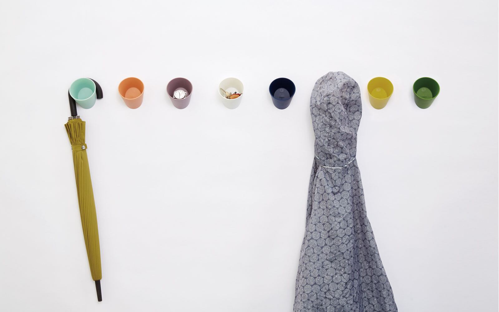 玄関ドアや冷蔵庫横、バスルームなどで、鍵やクリップなどの小物類をカップに収めます。フックとして雨具や帽子、ストールなどを掛けることもできます。
