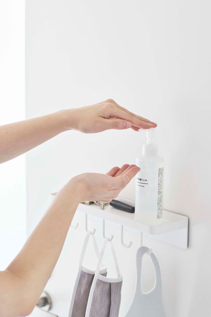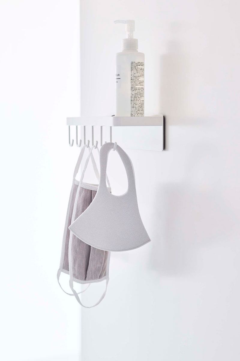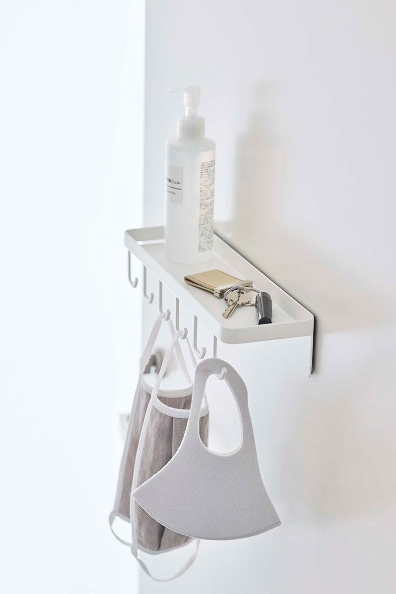 洗って繰り返し使えるタイプのマスクを玄関に収納できるマスクフック。上部はトレーになっていて、消毒ボトルも収納可能です。横向きのフックなので、マスク同士が触れ合わず清潔。また、奥行きがあるのでマスクがドアに密着せず清潔に収納できます。