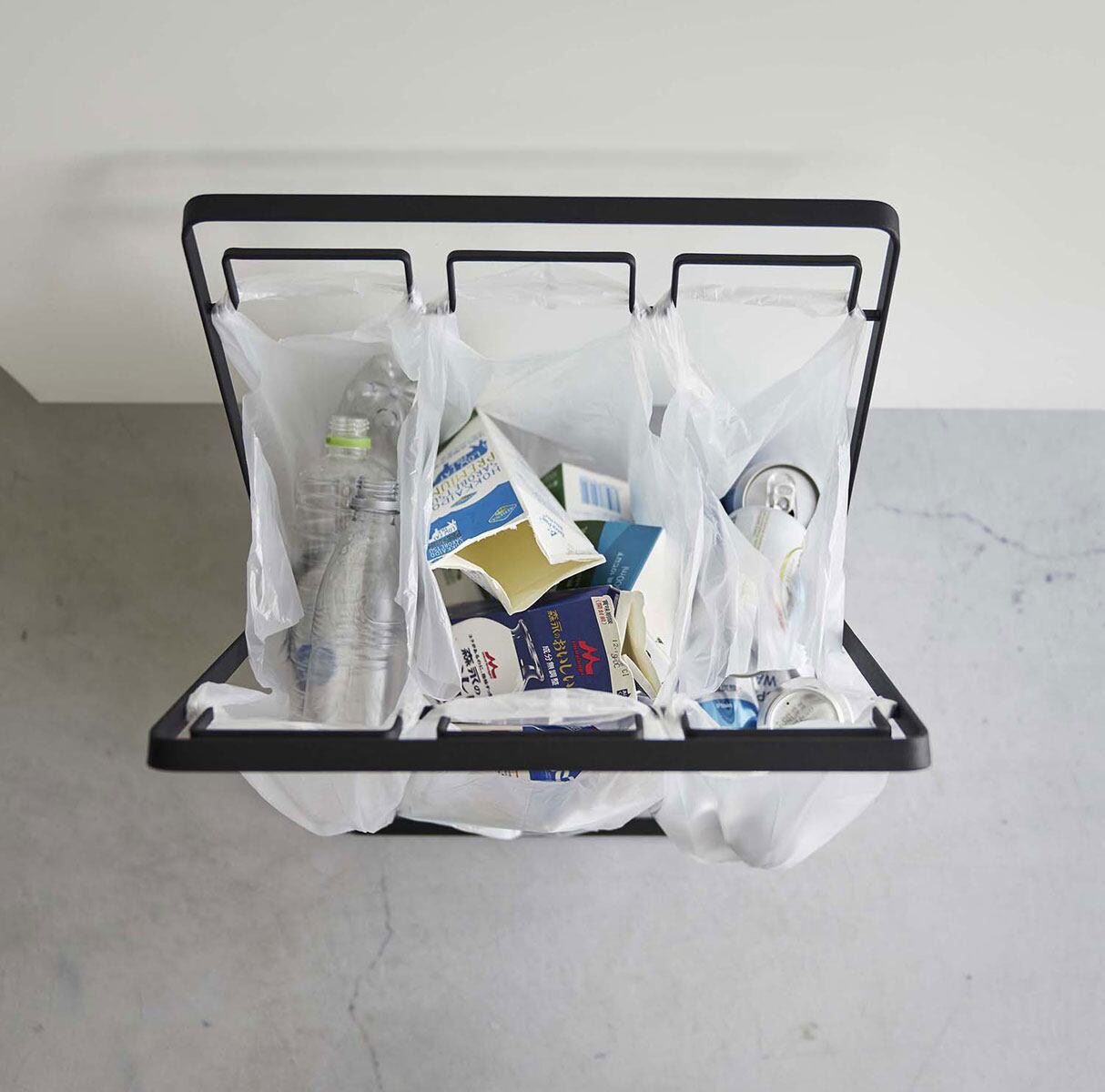 45Lのゴミ袋やレジ袋をそのまま掛けられ、分別も可能な開閉式のゴミ袋スタンド。レジ袋を引っ掛けるだけで野菜クズや食品トレーなどの資源ゴミを、手軽に捨てることができます。空き缶やペットボトルの分別も可能です。また、付属のフックには分別バサミ等の小物を掛けられます。