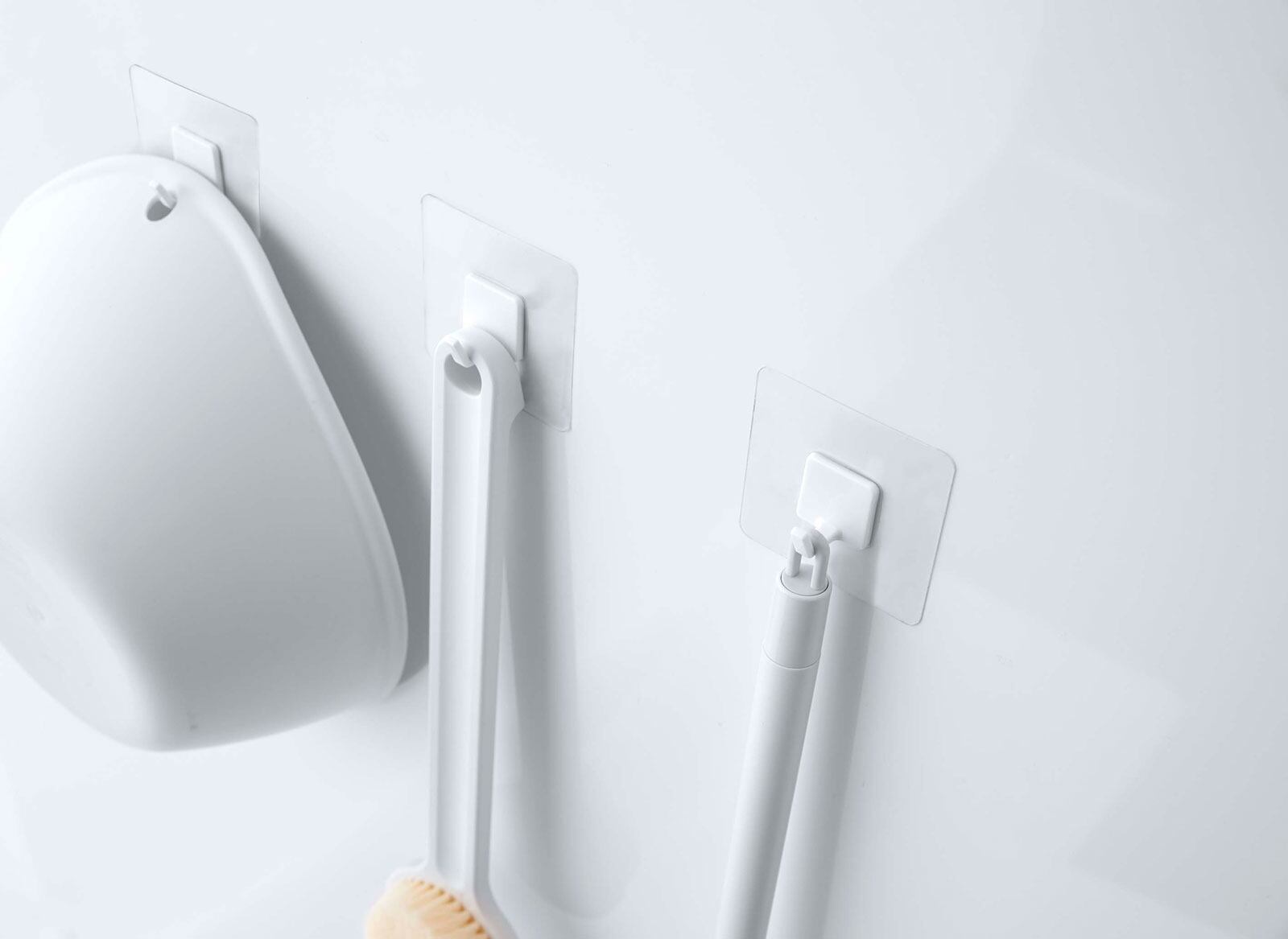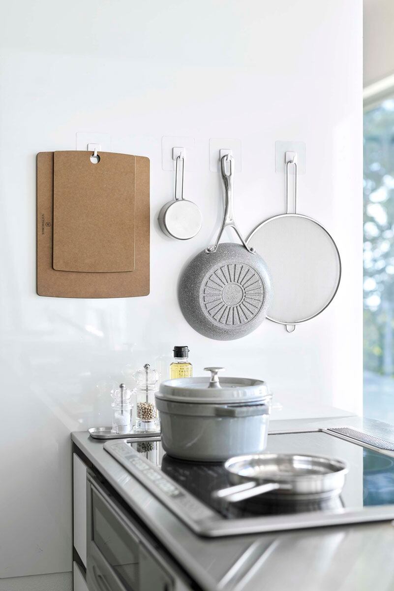 キッチンパネルなどの光沢面に貼ってはがせるフィルムフック Mサイズ4個セット。耐荷重約3kgでフライパンなども掛けられる丈夫なフックです。洗面器や掃除ブラシなども掛けることができます。