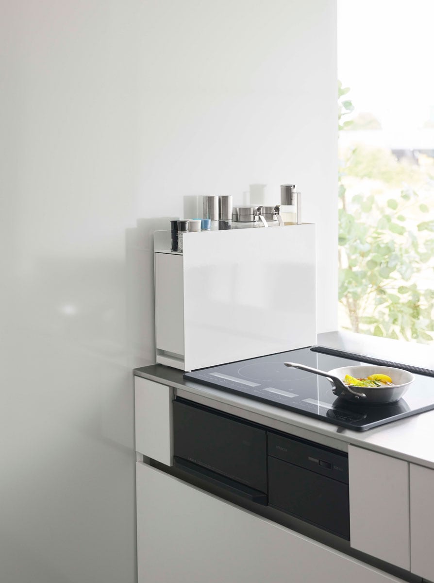 コンロの横の空きスペースに、調味料を隠して収納し、油跳ねで調味料が汚れるのを防ぎます。引き出し式で、油のボトル類も収納できる大容量の調味料ラック。小さいスパイス類や調味料ストッカーは、ガードが付いている上段に収納可能です。光沢のある本体で、お手入れもラクラクです。マグネットが付くので、タワーシリーズのマグネット商品(別売)を貼り付けて、さらに便利にカスタマイズできます。