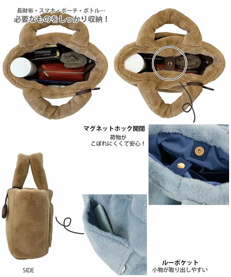 寒い冬の気分をあげてくれる、さわり心地の良いファーがほっこりうれしいトートバッグ。おしゃれ度アップのキュートなチャームがポイントです。小分けに最適な内ポケットなど、細部にまでこだわったつくりです。出し入れスムーズなルーポケット(外ポケット)には、すぐに出したい鍵やスマホ、マスクなどの小物の収納に便利です。
