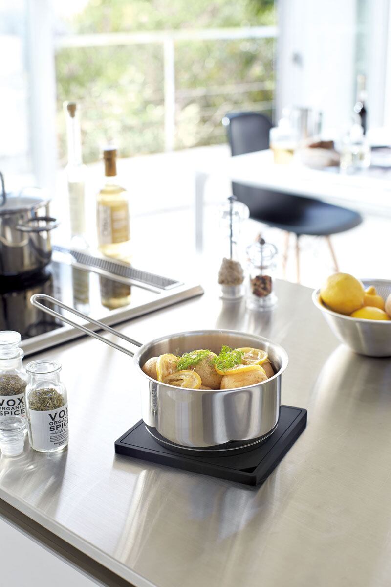 調理中の鍋の一時置きはもちろん、重量のある鋳物ホーロー鍋もしっかり置けるシリコン製鍋敷き。しっかり厚みもあるので、調理中の鍋などを置いても安心です。フック穴付きで、未使用時はフックに引っ掛けて収納もできます。