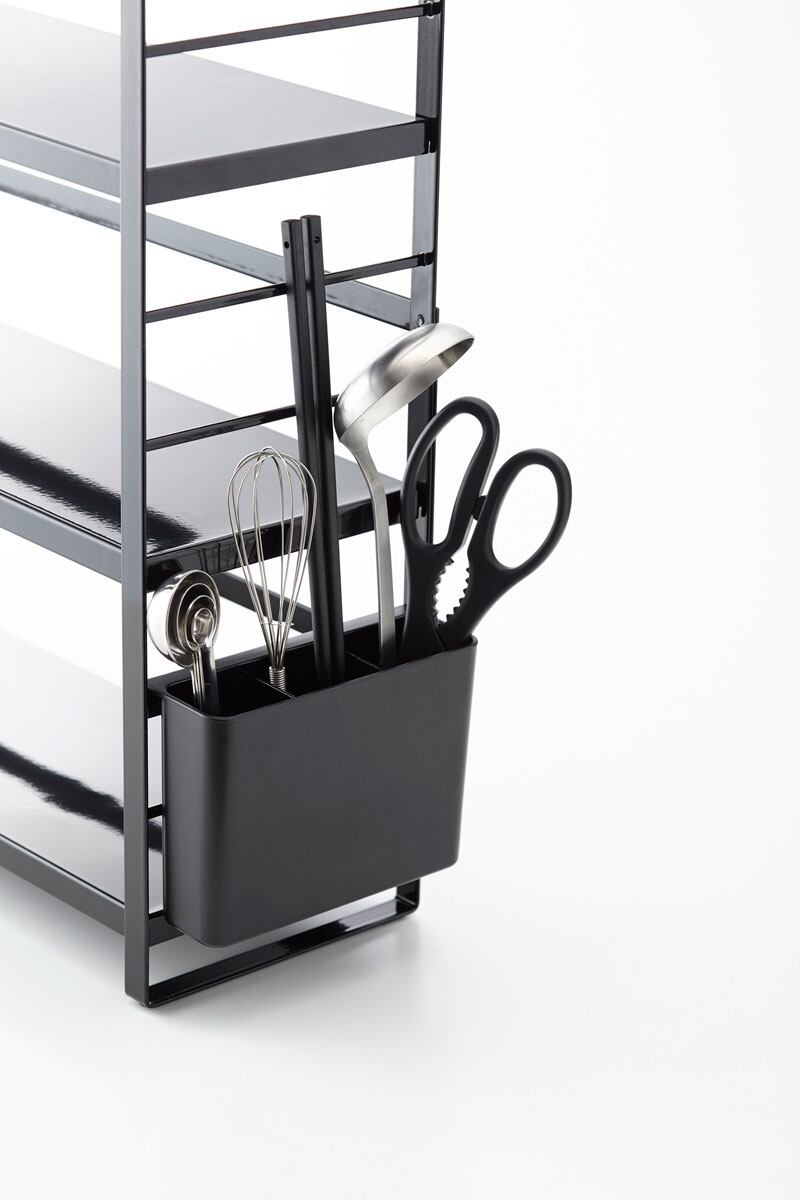 コンロ奥や横の隙間や、シンク上のデッドスペースを活用できるシェルフです。調理道具が掛けれるフック x5個と使いたい時にサッと取り出せるカトラリーポケット付き。棚の高さは5cm間隔で変えられ、調味料、スパイス類、キッチン道具、小物類を一括収納できます。