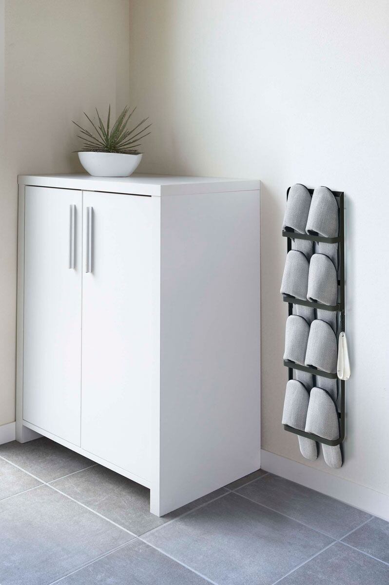 下駄箱の横や扉に引っ掛けて使う、省スペース型スリッパラックです。滑り止め付きでピッタリフィット。折りたたみ傘や靴べらを引っ掛けられる小物用フック付きです。