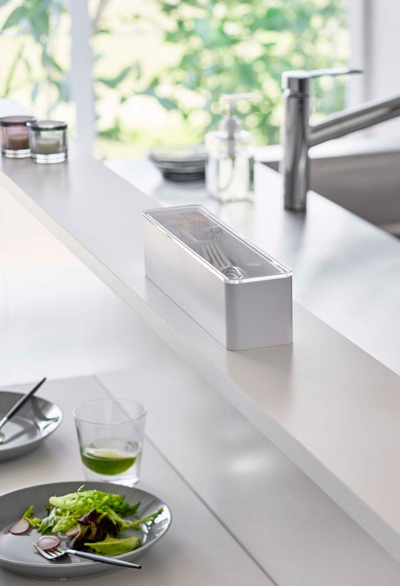 埃やゴミが気にならない、中身が見えて使いやすい蓋付きのカトラリーケース。深さが異なる仕切り付きで、お箸やカトラリー、爪楊枝や箸置きなども一括収納します。お箸やカトラリーを浮かせて収納できる構造で衛生的です。スリムだからキッチンカウンター上にも置けます。