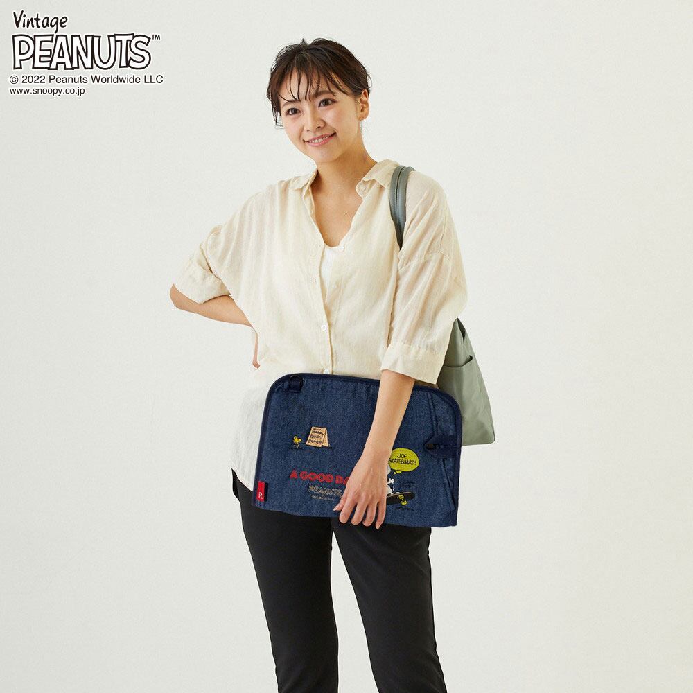 ノート型PC用トート、ピモッテ。スヌーピーの刺繍がかわいいピモッテ。デニム生地に大胆にスヌーピーの刺繍を施しています。シーンに応じてバッグのインナーにも、そのまま持ち歩けるトートにもなります。13インチのノートPCに対応し、コの字型についたダブルファスナー仕様で、縦横どちらからも中身を出し入れできます。