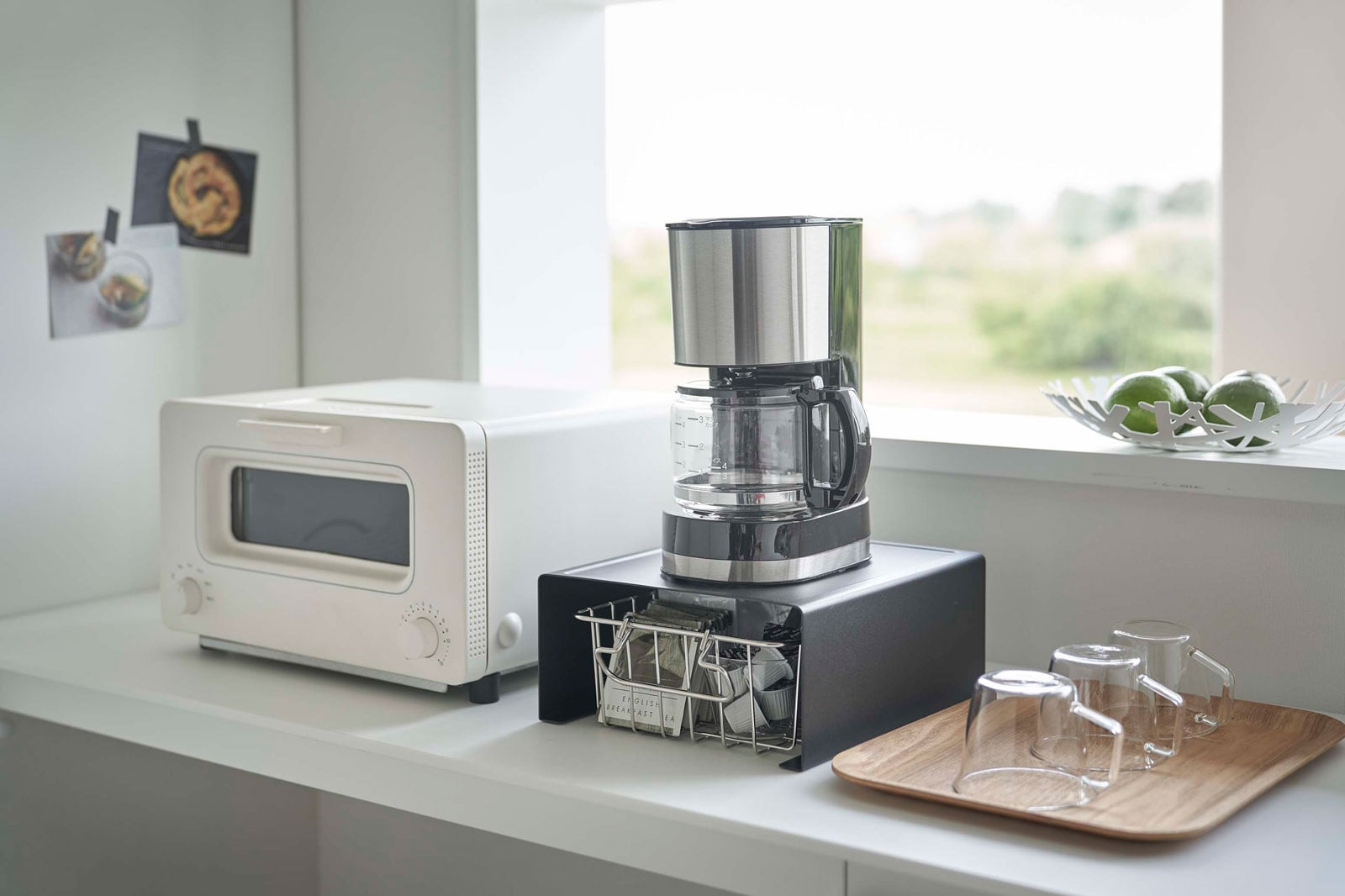 電気ケトルやコーヒーメーカーの下を有効活用、便利で丈夫なキッチン家電下ラックです。キッチン家電の下には、よく使う物をまとめて収納可能です。バスケットなどを使って紅茶やコーヒーグッズを収納したり、トレーにコップを置いて収納しても便利です。