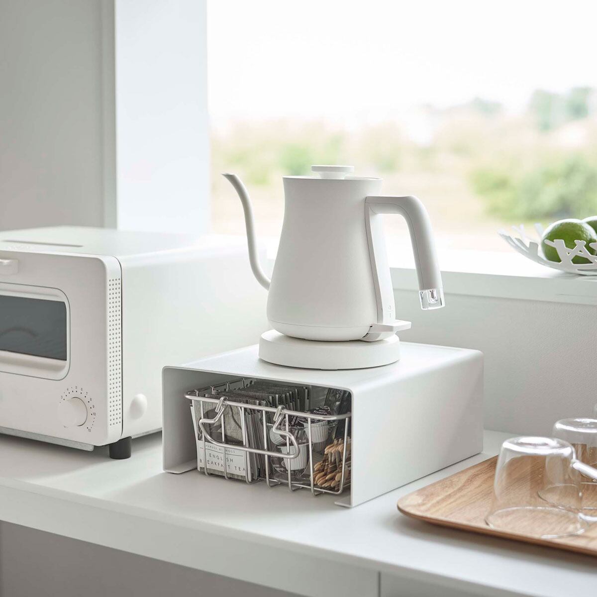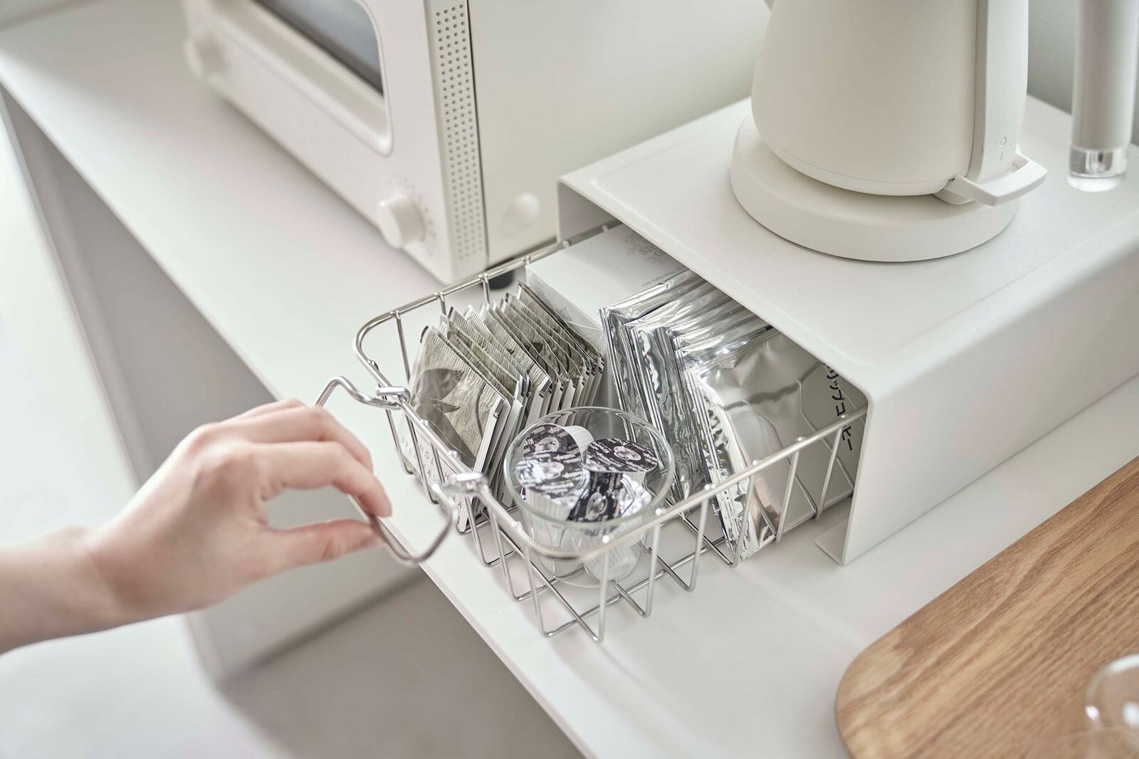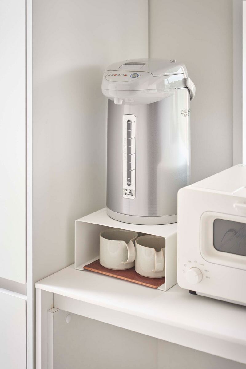 電気ケトルやコーヒーメーカーの下を有効活用、便利で丈夫なキッチン家電下ラックです。キッチン家電の下には、よく使う物をまとめて収納可能です。バスケットなどを使って紅茶やコーヒーグッズを収納したり、トレーにコップを置いて収納しても便利です。