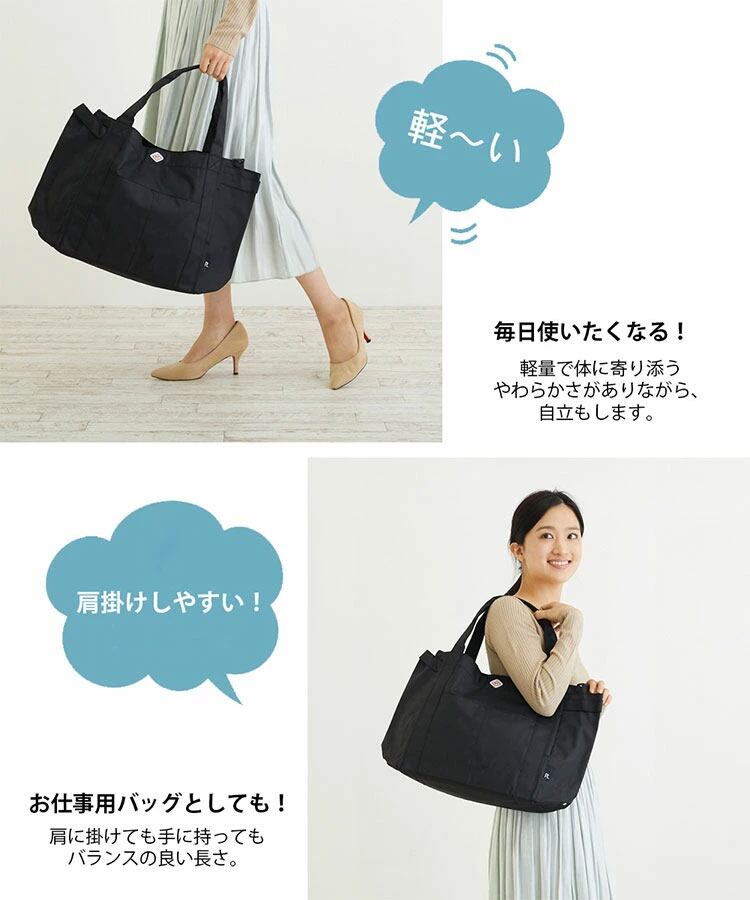 きっと毎日使いたくなるバッグ。「しまう」と「出す」を快適に。折りたたみの傘や水筒を立てて持ち運べる2つのポケットのほか、スムーズに出し入れにこだわった8つのポケット付き。毎日にちょうどいいサイズ。軽いポリエステル素材の本体(約300g)に、A4サイズの書類や13インチPCもラクラク収納できます。