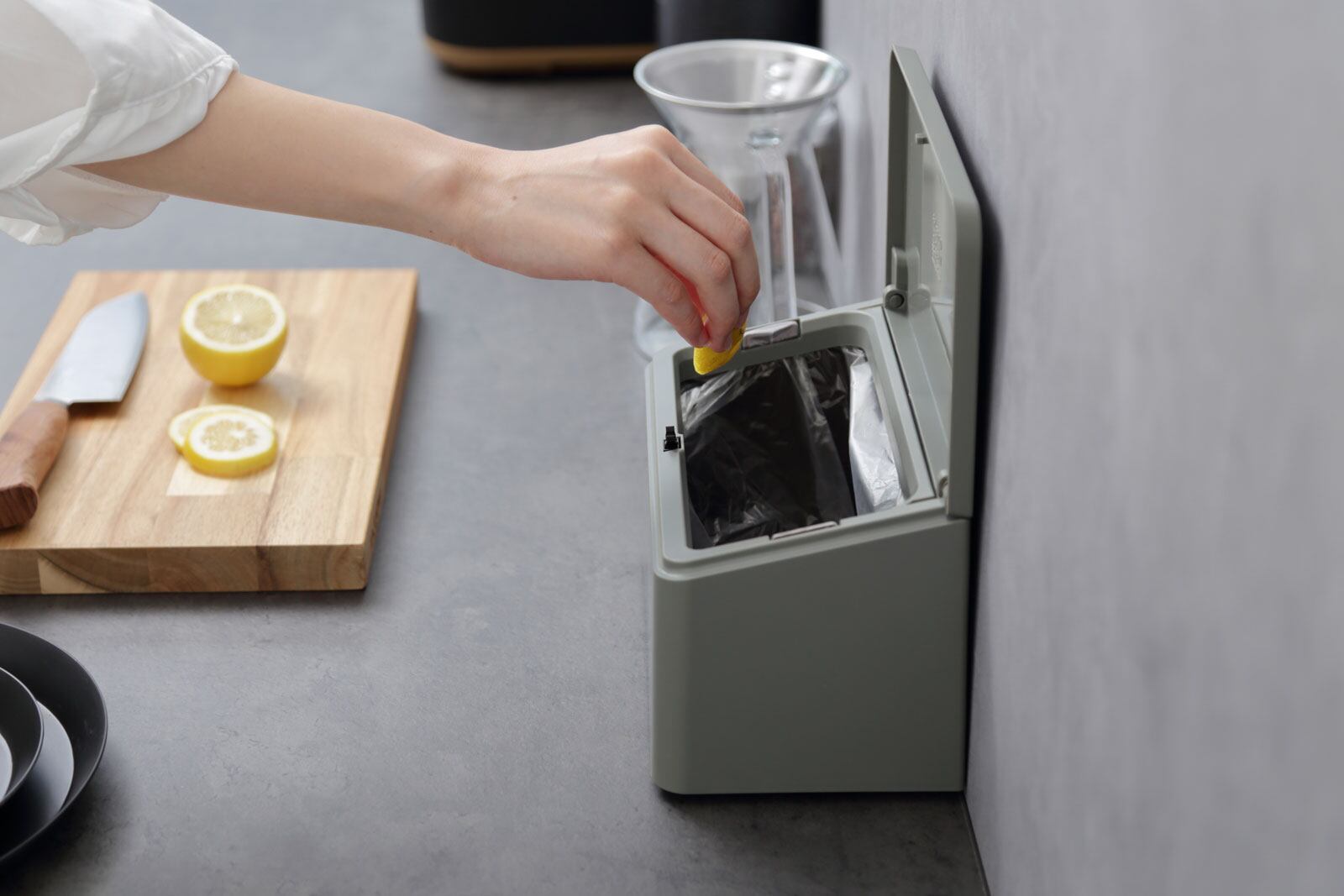 キッチンカウンターで使えるチューブラー。背が低く、圧迫感がないので卓上にもピッタリ。ゴミ箱の投入口は幅広で、斜めになっているので、まな板から直接ゴミを捨てやすい設計。壁にピタっと沿わせて置けるのでキッチンも広々お使いいただけます。