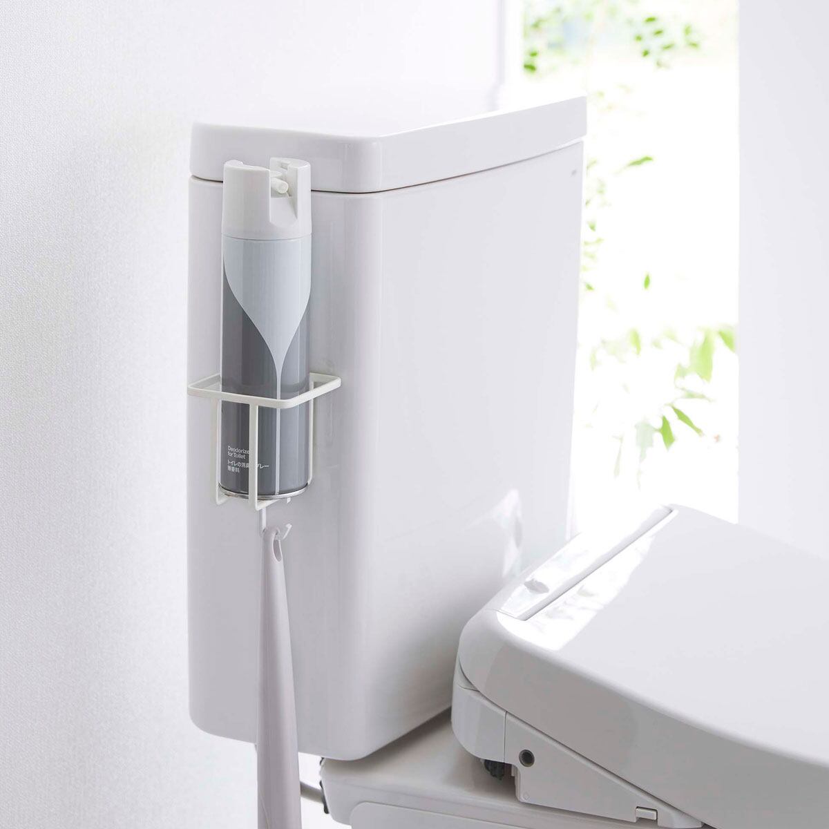 フィルムフックでトイレタンクやタイルに、浮かせて設置できるスプレーボトルホルダーです。フィルムフックに差し込むだけの簡単設置。スリムタイプの消臭スプレーにも対応。付属のフックでトイレブラシも簡単収納できます。浮かせて収納できるから、床のお手入れも簡単です。