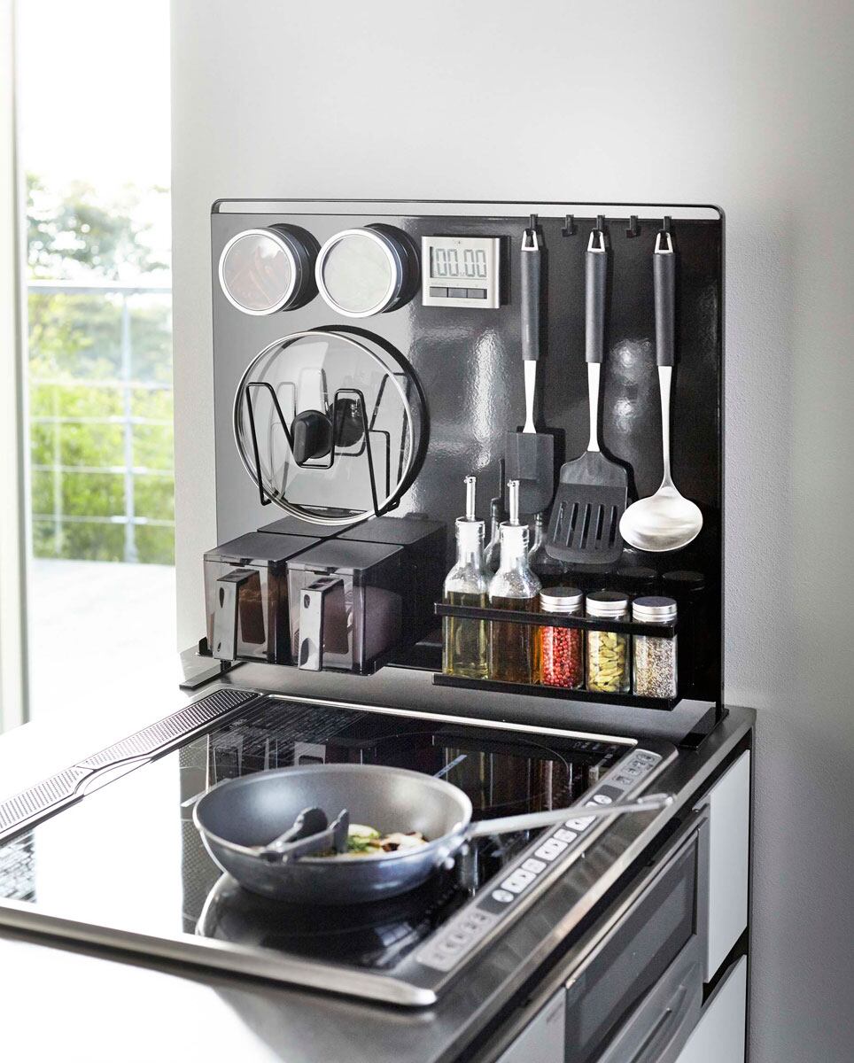 別売りのマグネット収納ツールを自由に組み合わせできるキッチン収納パネルです。コンロやシンク周り、調理場の奥(デッドスペース)を有効活用します。油跳ね、水跳ねガードとしても便利です。