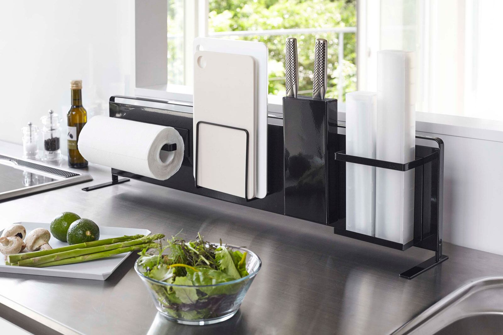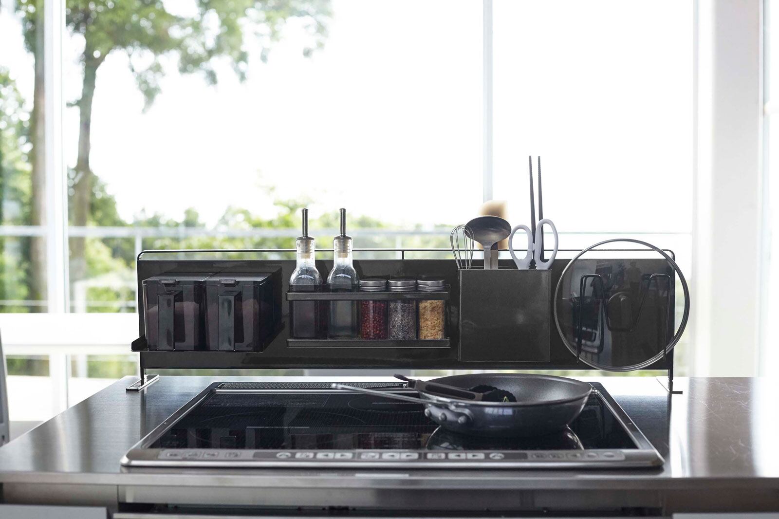 別売りのマグネット収納ツールを自由に組み合わせできるキッチン収納パネルです。コンロやシンク周り、調理場の奥(デッドスペース)を有効活用します。油跳ね、水跳ねガードとしても便利です。