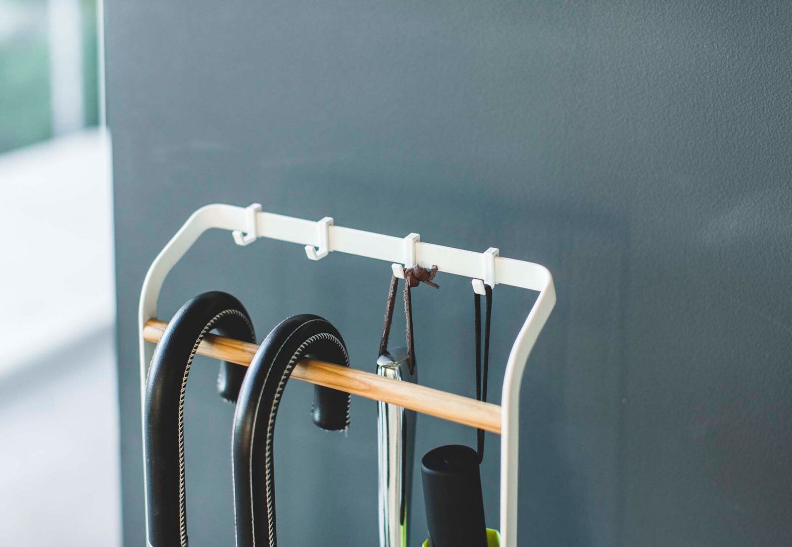 4つのフック付きで、折りたたみ傘や靴べらなど、収納場所に困る小物類もまとめて収納できます。場所をとらないスリムな設計で、玄関など置く場所を選びません。