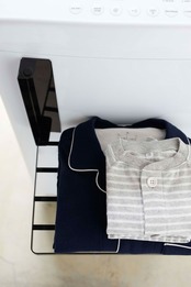 マグネットで洗濯機の正面や側面に簡単取り付け。入浴後の着替えやバスタオルなどを一時置きできる便利な折り畳みラックです。ついつい洗濯機の上に置いてしまう、お風呂上りに使いたいバスタオルや着替えを一時置きに便利です。