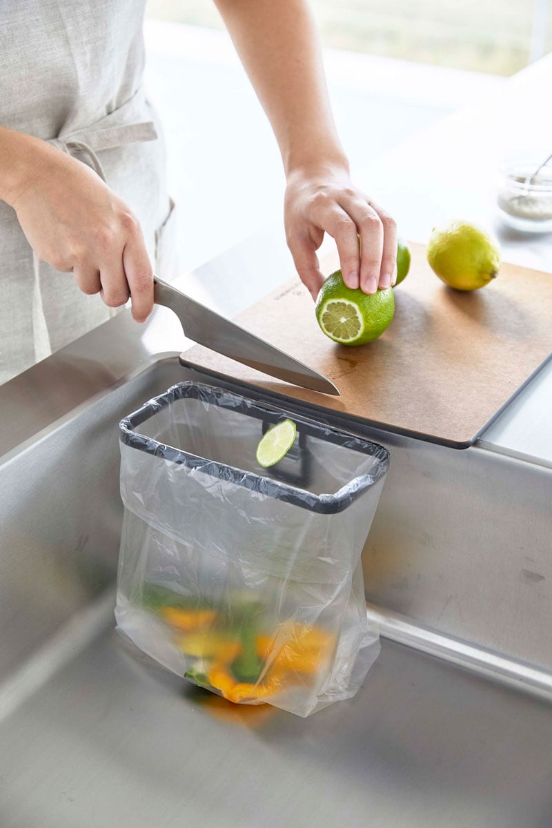 ポリ袋を掛けて調理中に出るゴミをその場でポイ。ポリ袋を掛けるだけの簡易ゴミ入れ。ポリ袋の取り外しも下からサッと引き抜くだけ、簡単にゴミ捨てができます。
