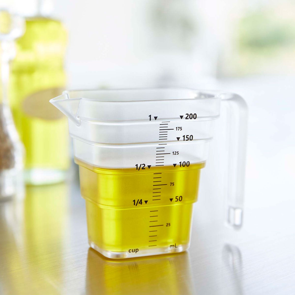 耐熱温度100℃で、食洗機にも対応の便利な段々計量カップ。200mlの容量には50mlごとに段差があり、5ml単位のメモリが付いています。この段差形状は上からもメモリが見えやすく、料理やお菓子作りにおいて簡単な計量が可能です。