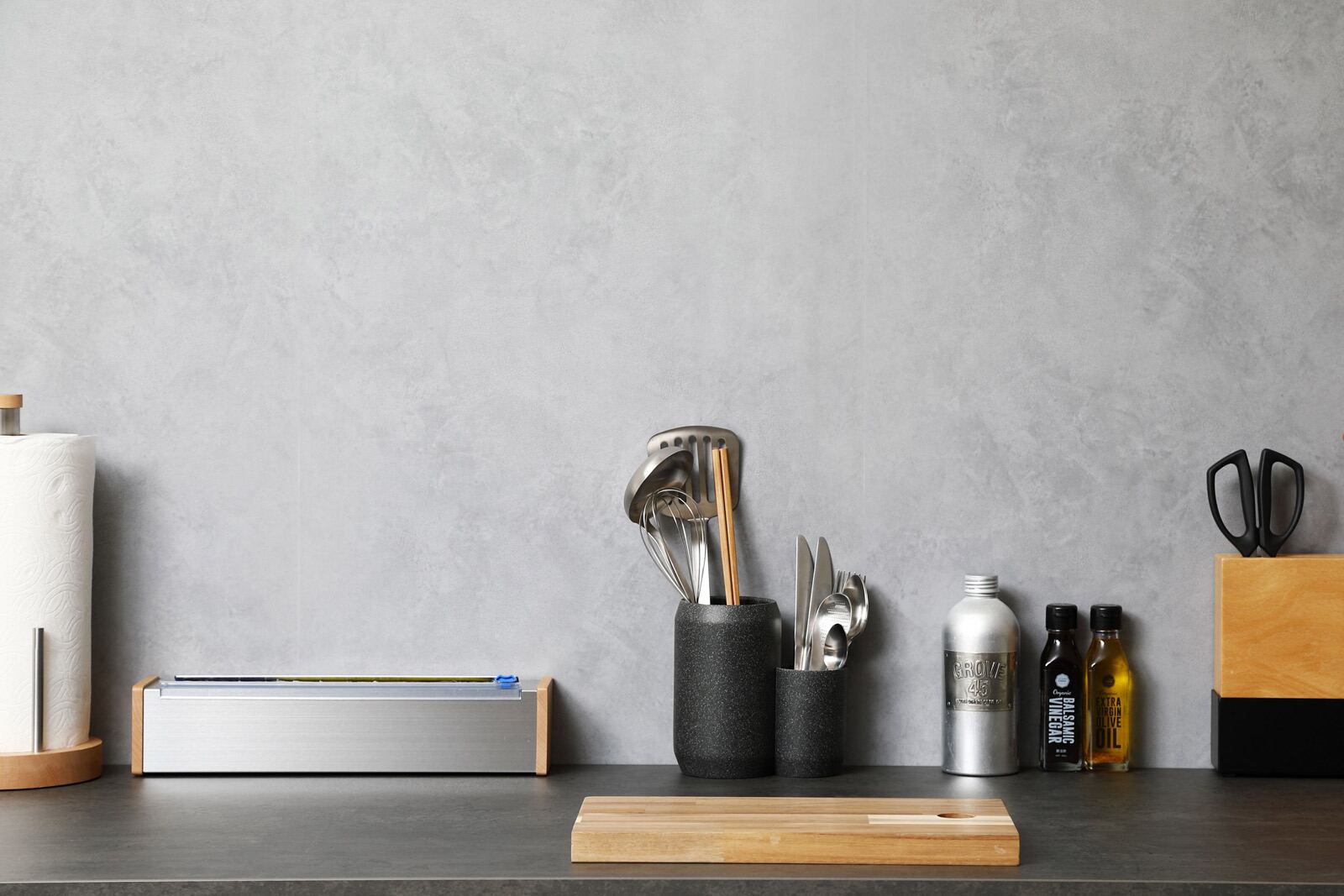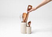 入れ口の径が絞られているため、ツールがまっすぐに立ち、美しく収まります。天然石をポリエステル樹脂で固めたストーンパウダー素材で作られ、適度な重量があり安定感があります。キッチンだけでなく、洗面や工具入れなど様々なシーンで活躍します。