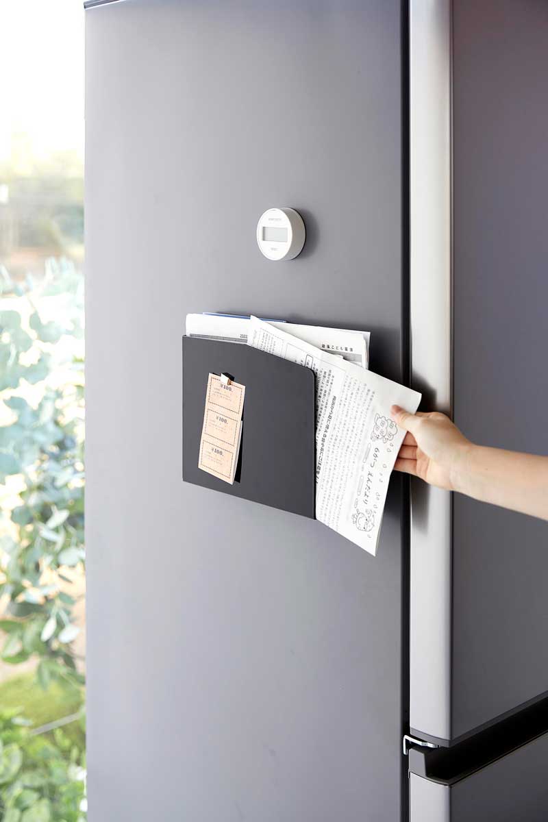 お好みの向きを選んでマグネットで簡単に取り付けることができるプリントケース。散らかりがちのプリントをまとめて収納でき、マグネットは左右どちらの面にも貼り付けられるので、お好みの向きで自由に使用できます。横向きに設置しても出し入れがしやすく、スリムなデザインで隙間を有効活用します。