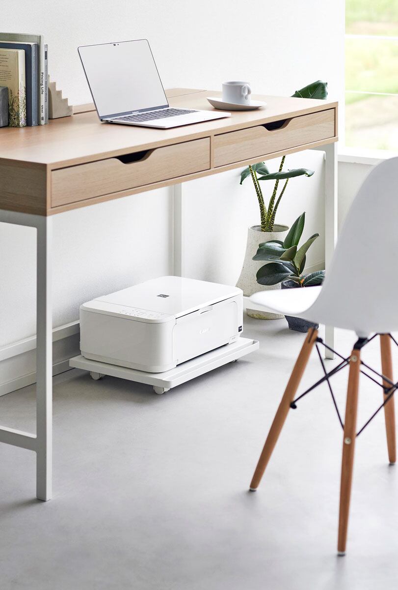 使う時だけ引き出せる便利なキャスター付きのプリンターラックです。使わない時はデスク下にすっきり収納でき、A4プリンターにピッタリのシンプルなラックとして最適です。キャスター付きなので、移動もスムーズで、加湿器の収納にも便利です。