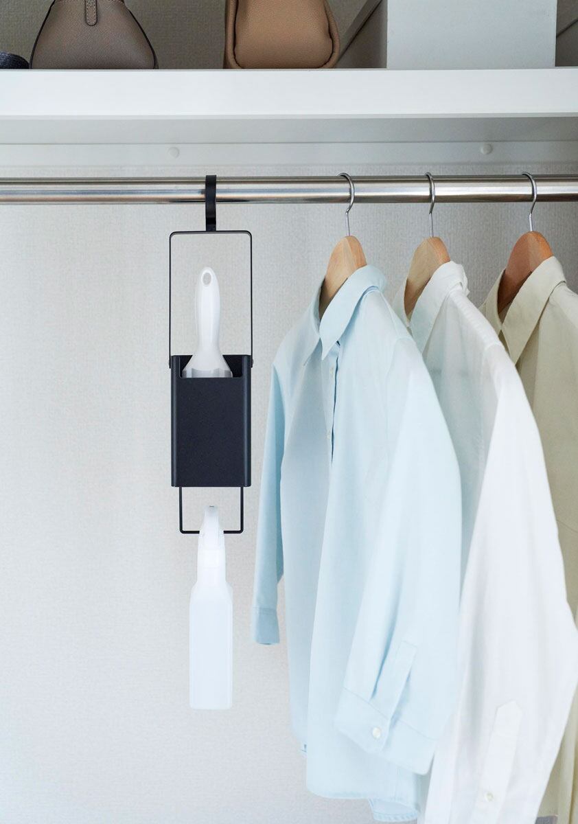 毛玉取りや衣類用ブラシなどのクリーナーツールを一括収納できるアイテム。下部のハンガーには衣類用消臭スプレーも引っ掛けて収納可能。コートハンガーやクローゼットに取り付けて、使いたい時にサッと必要なアイテムが手に入ります。
