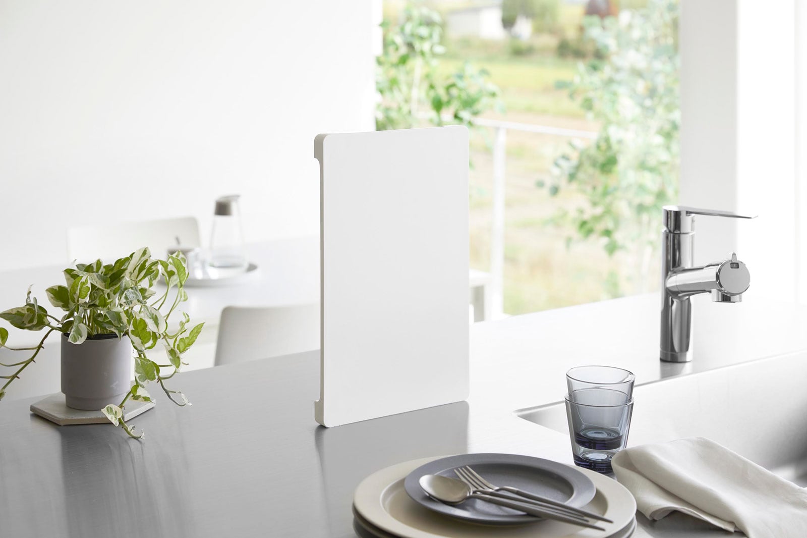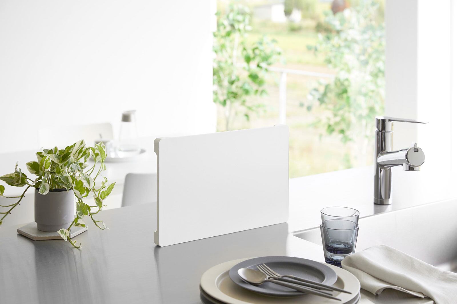 マグネットで浮かせて収納できるtowerの食洗機対応まな板。マグネットでキッチンパネルに浮かせ収納できるので、水切れが良く、衛生的。単体でも自立するスリムデザインで、場所を取りません。