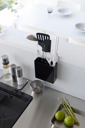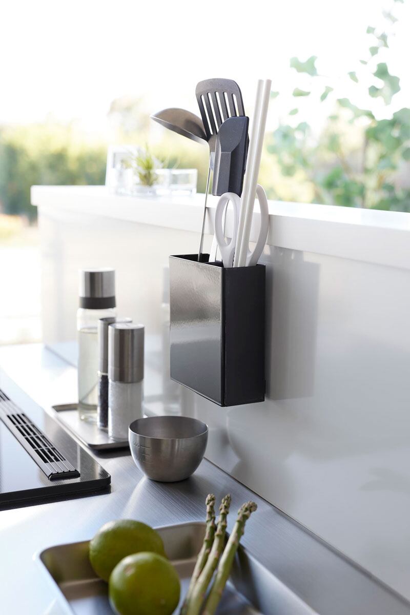 フィルムフックでお好みの位置に簡単に取り付けできるキッチンツールホルダーです。底面はシリコーンマット付きで、取り外してサッと洗えます。仕切り付きで調理道具をきれいに整頓できます。