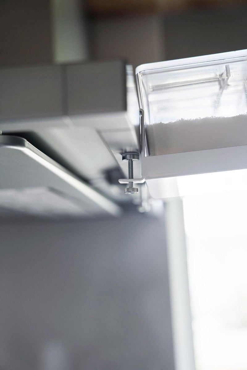 レンジフードに挟むだけ。レンジフードのお好みの位置に簡単取り付けできる調味料ラックです。浮かせて収納して、調理中の使いたい時にサッと取ることができて便利です。