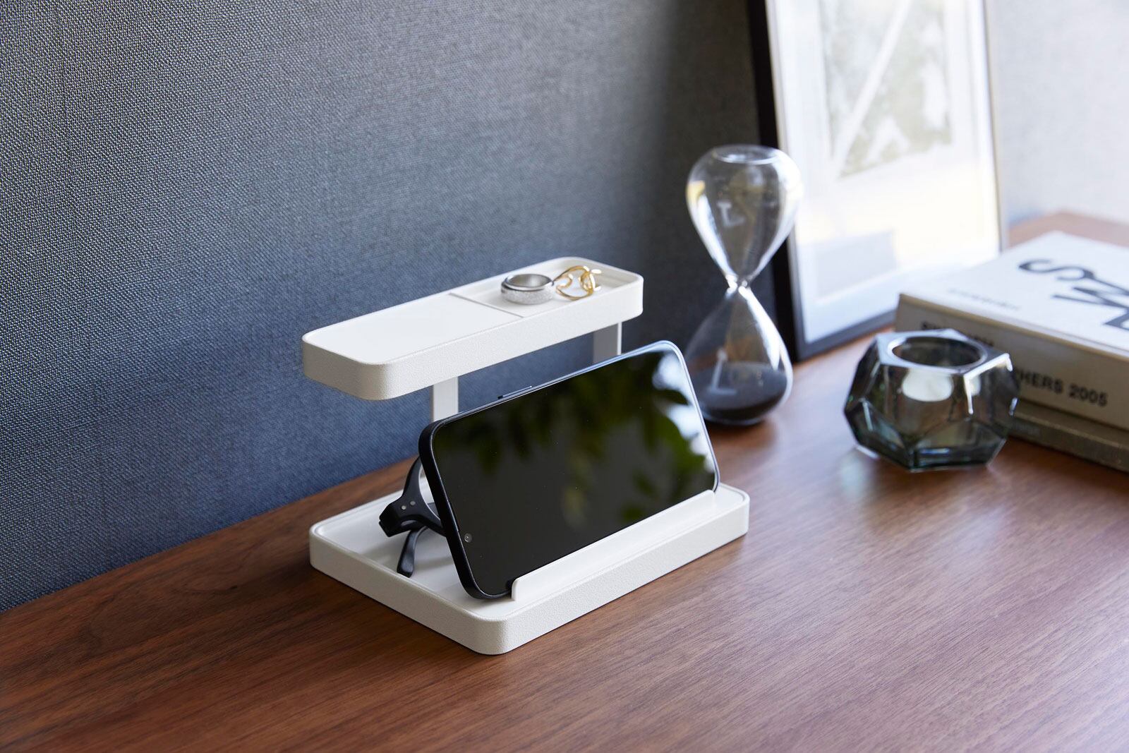 スマートフォンやスマートウォッチ、ワイヤレスイヤホンなどを、一括収納できるモバイル充電ステーションです。トレーには、メガネや替えベルトの収納ができます。ワイヤレスイヤホンの収納ができる小物トレーも。