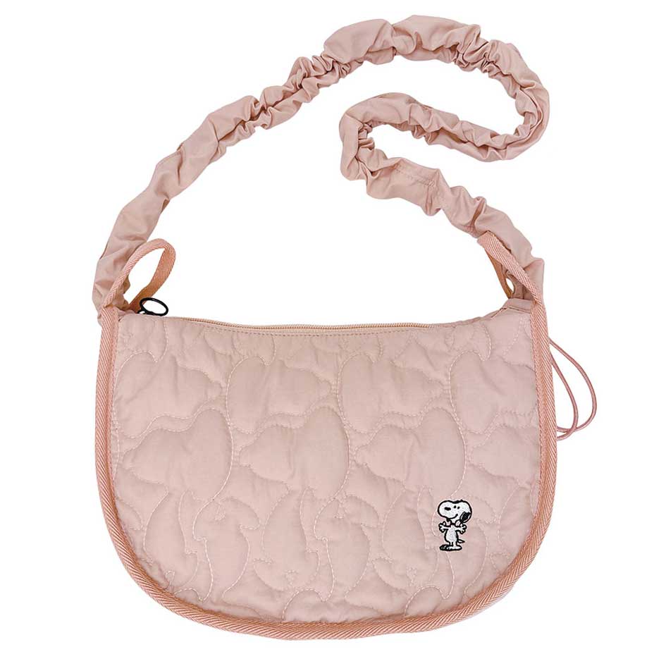 スヌーピーのかわいいワンポイント刺繍がアクセントに。丈夫なナイロン生地に、スヌーピーのシルエットのキルティング加工を施したショルダーバッグです。軽くてふんわり、触り心地も気持ち良い。体に寄り添うやわらかさがあり、持ち運びに便利です。