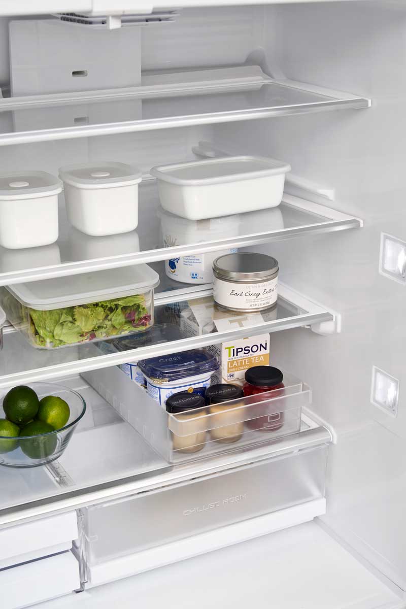 冷蔵庫奥のスペースも使えて、冷蔵庫内がスッキリ整う収納ケースです。ハンドルが付いているのでラクに引き出せて、奥の物も取り出しやすい設計です。お好みの位置に変更できる仕切り付きで、種類や賞味期限ごとに分けて収納できます。