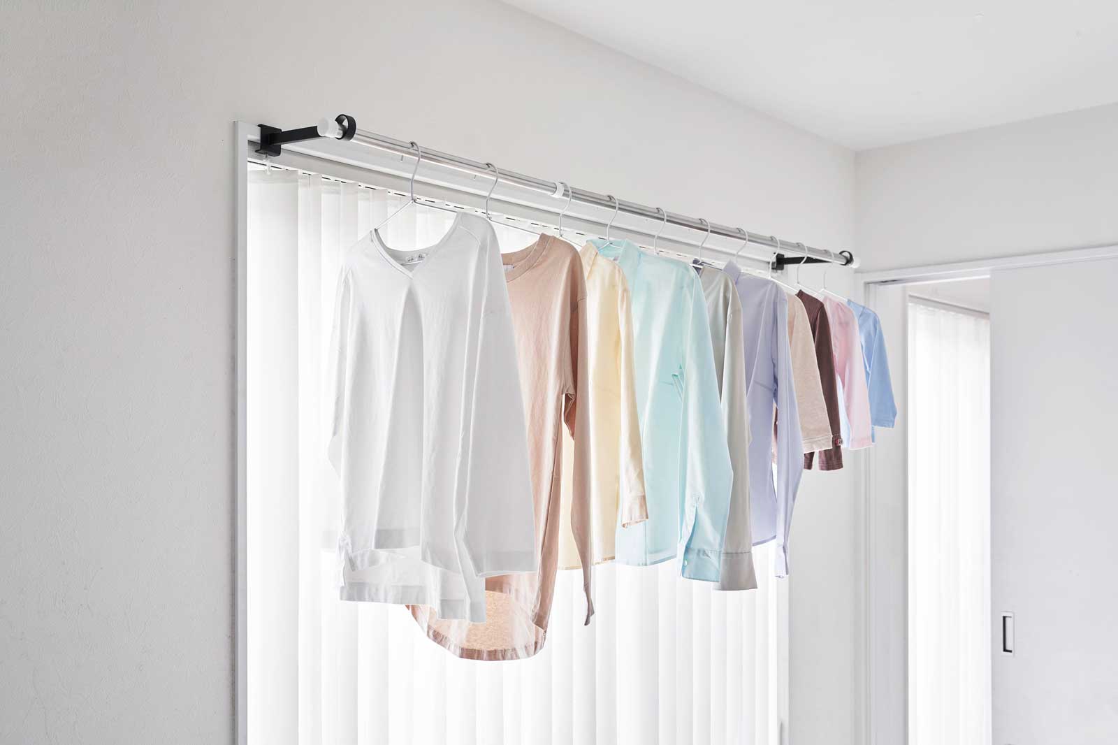 奥行きがワイドで、スライド扉やカーテンを閉めた状態でも干すことができ、カーテンやドアに洗濯物が当たって乾きムラになるのを防ぎます。調節ネジで枠にしっかり固定でき、さらに、枠の上部にピンを刺し込んで落下を防ぎます。