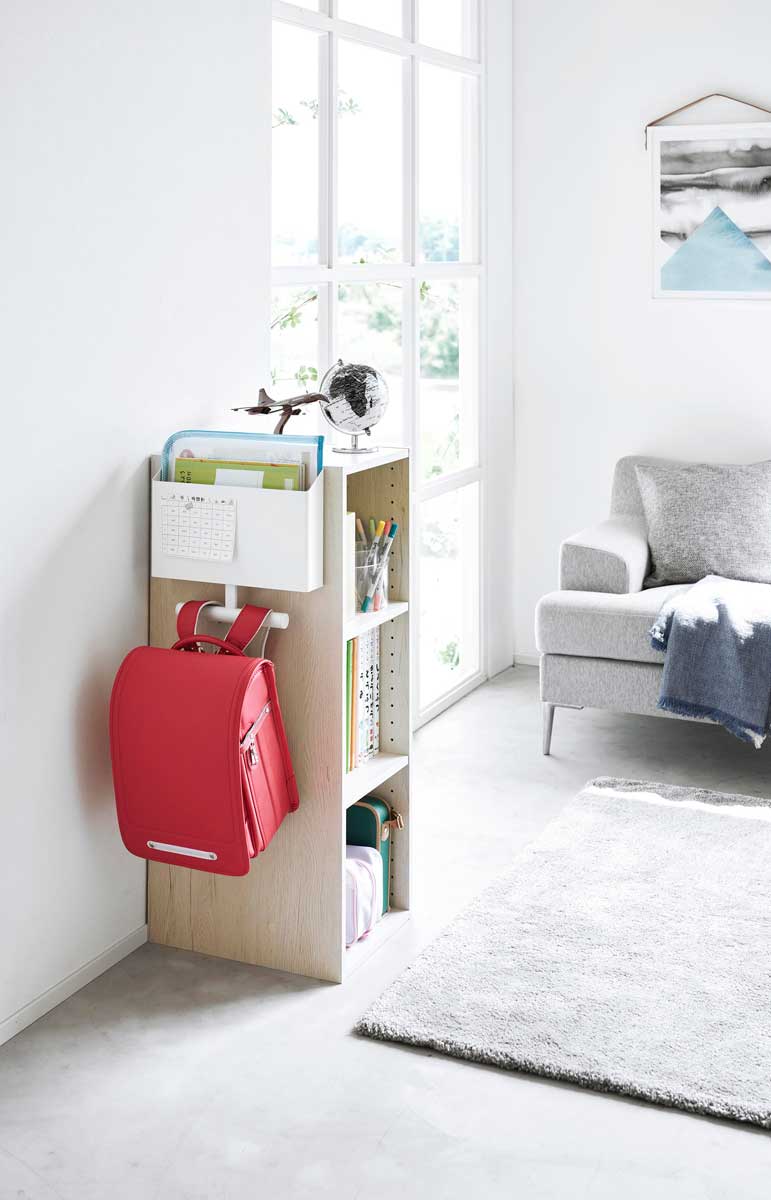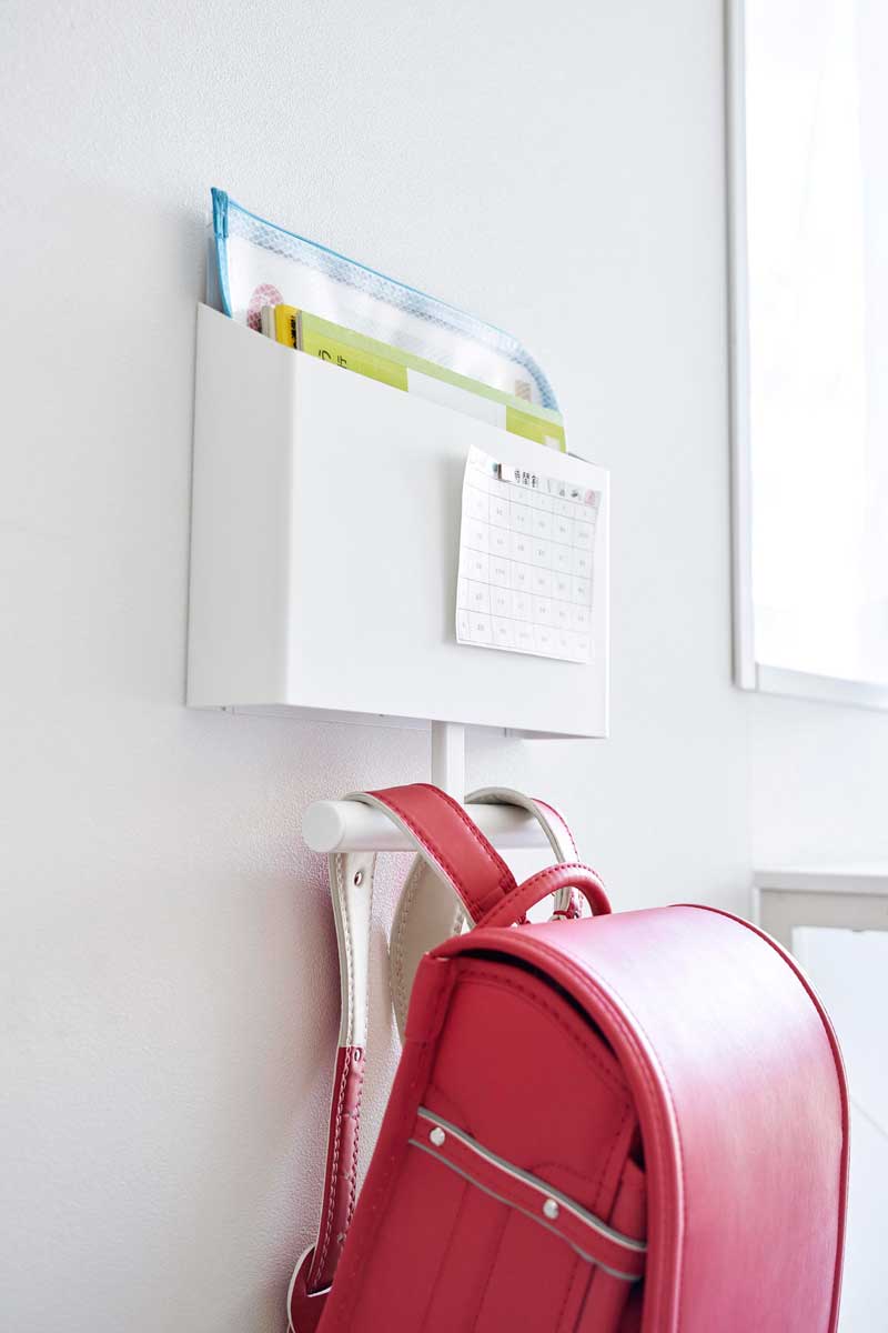 お子様の持ち物を一括収納できるファイルボックス&ランドセルハンガーです。壁の穴が目立たない石こうボードピンのほか、木ネジでも取り付けできます。